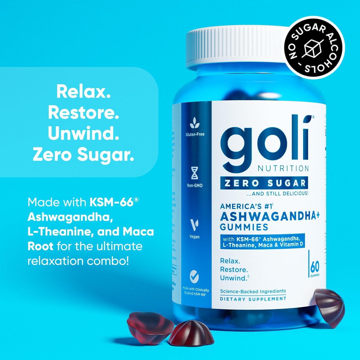 Goli Zero Sugar Ashwagandha Gummies with KSM-66, L-Theanine, Maca and Vitamin D – No Sugar Alcohols – Vegan, Keto-Friendly, Non-GMO(60 Count (Pack of 3))